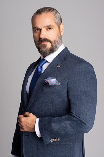 Americana de sport con dos botones y dos aberturas. Elegante y funcional. Combinados a contraste en ojales de solapa y puño. Tejido espiga.